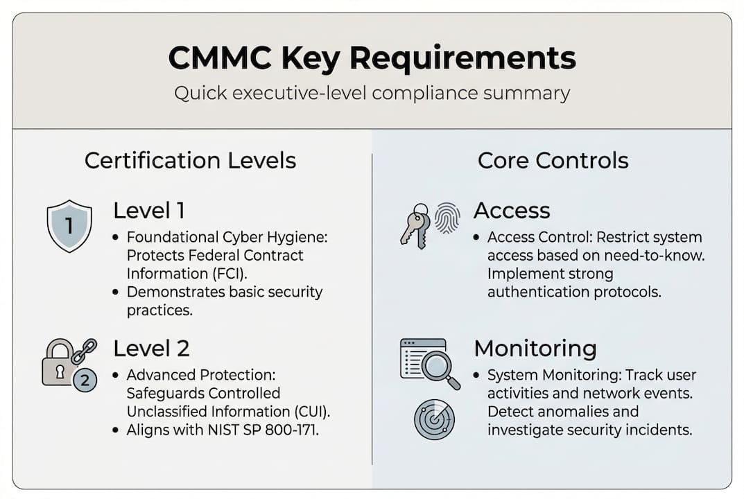One critical point many executives miss: CMMC requirements flow down. If your prime contractor handles Controlled Unclassified Information (CUI), that obligation extends to every subcontractor in the supply chain. Understanding the CMMC implementation process from the start prevents costly surprises later. For a broader view of what this means operationally, cybersecurity for government contractors is a useful starting point.