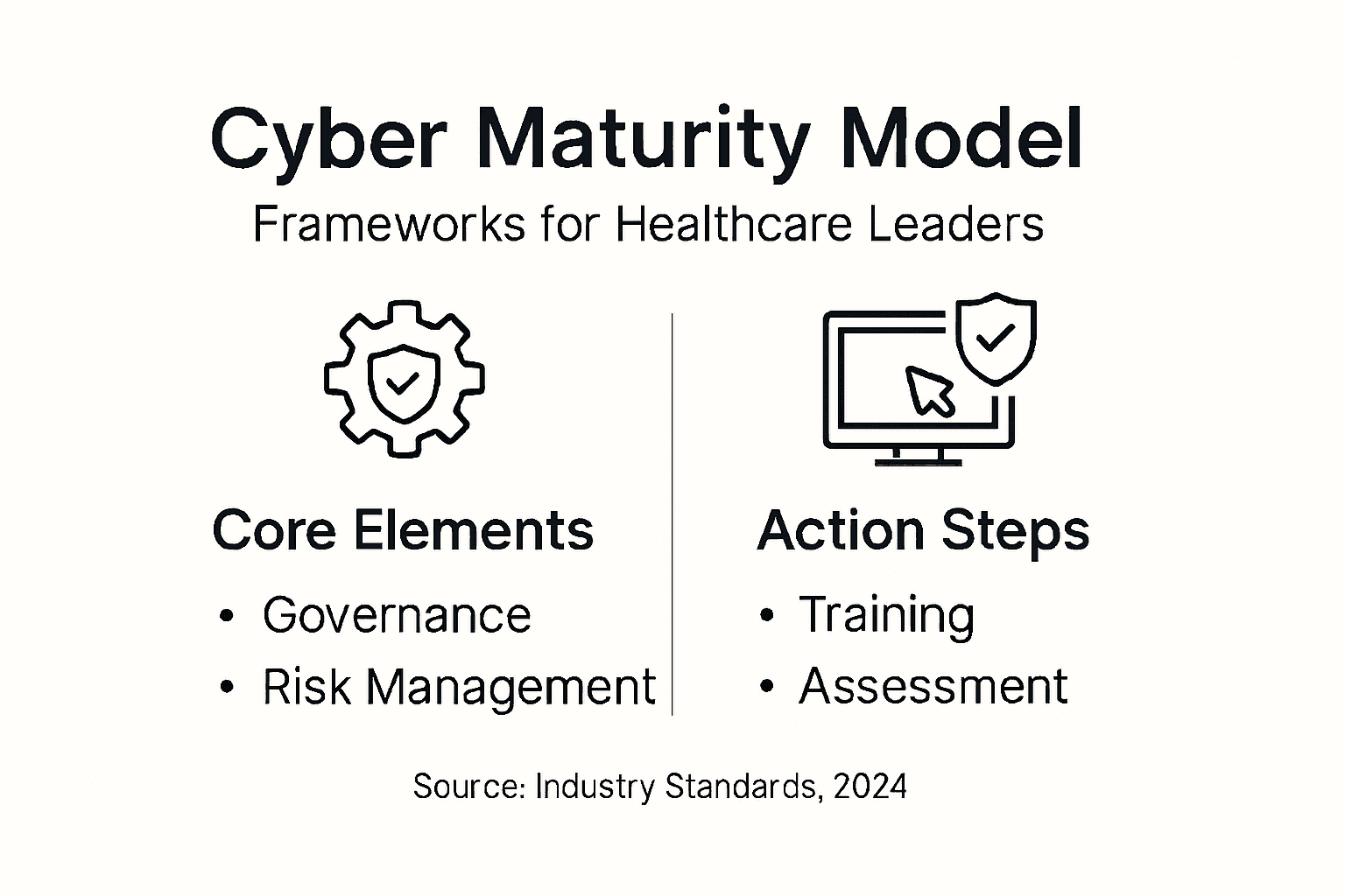 Healthcare cyber maturity involves several key dimensions that executive leaders must systematically address: