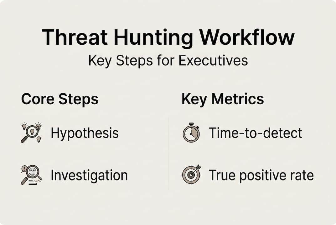 Key executive KPIs to track from day one include time-to-detect (TTD), true positive rate, ATT&CK technique coverage percentage, and number of completed hunts per quarter. A detailed process guide and a threat hunting checklist can help teams maintain consistency across every engagement.
