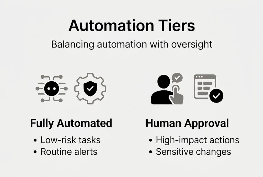 Tiered automation means fully automating low-risk tasks, requiring human approval for high-impact decisions, and never fully automating irreversible actions. This principle is not just operationally sound. It is increasingly a regulatory expectation.