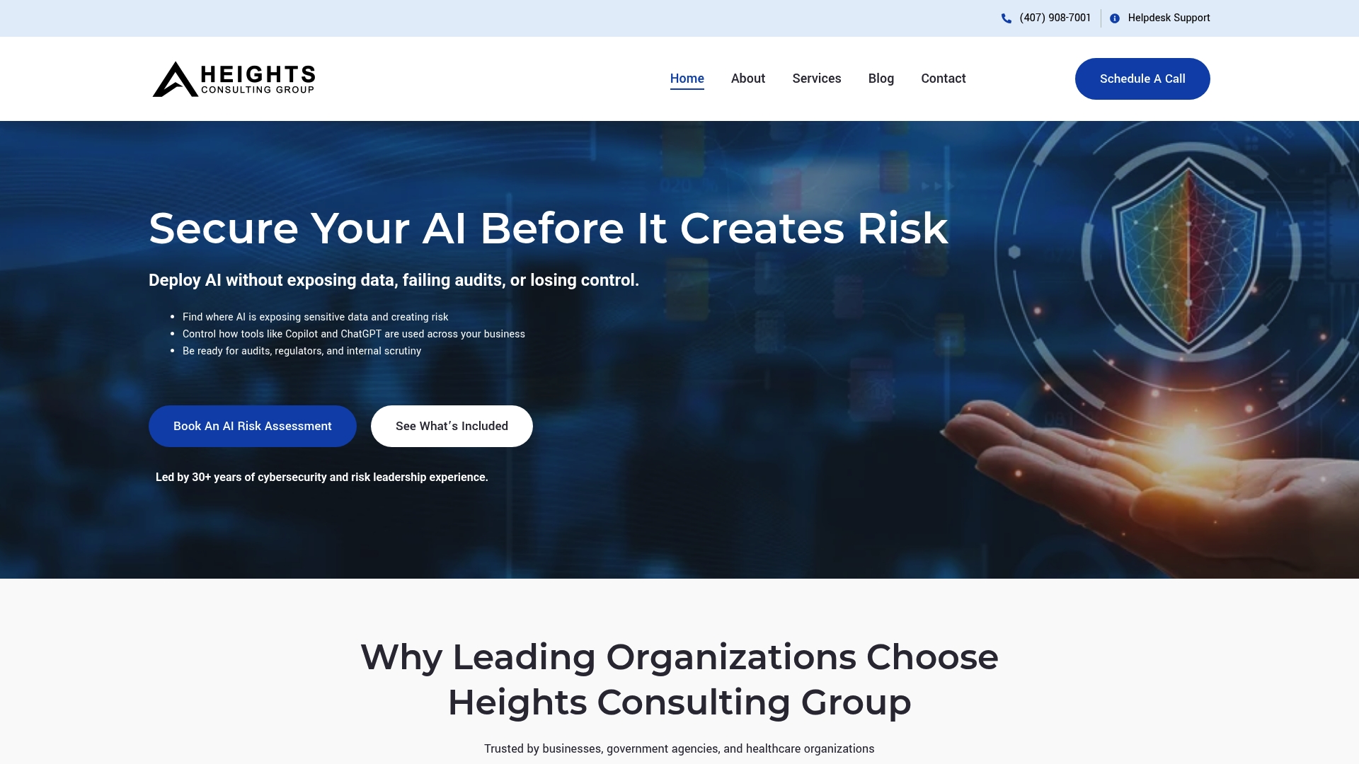 Heights delivers strategic advisory, risk governance, and regulatory compliance services designed around NIST, CMMC, HIPAA, and SOC 2 frameworks. The firm pairs AI security and emerging technology security planning with managed cybersecurity services including 24/7 monitoring and incident response.