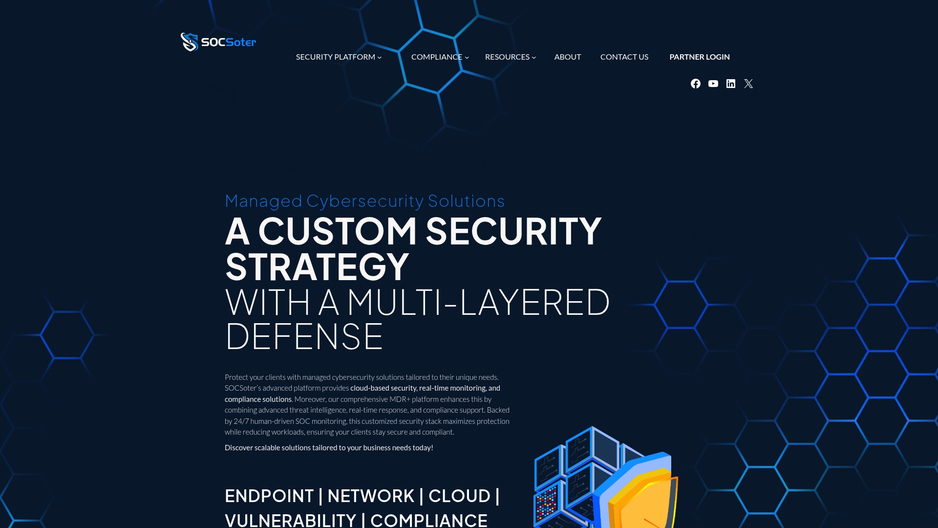 SOCSoter provides real time monitoring, a multi layered defense approach, and centralized visibility across endpoint network cloud and vulnerability management. The service includes customizable security strategies, unlimited integrations on a unified portal, and U.S. based analysts handling threat analysis and response.