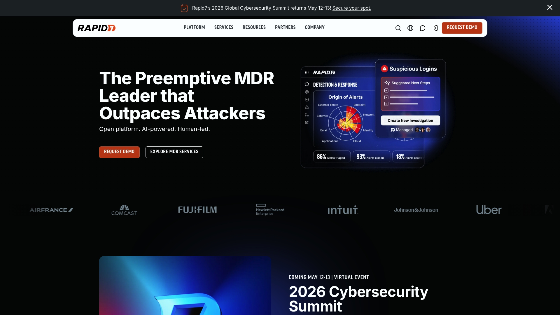 Rapid7 provides an open platform with AI powered analytics paired with human oversight to reduce alert noise and accelerate investigations. Core capabilities include Managed Detection and Response, exposure and attack surface management, next generation SIEM, cloud security for multi cloud environments, vulnerability management, and external threat intelligence.